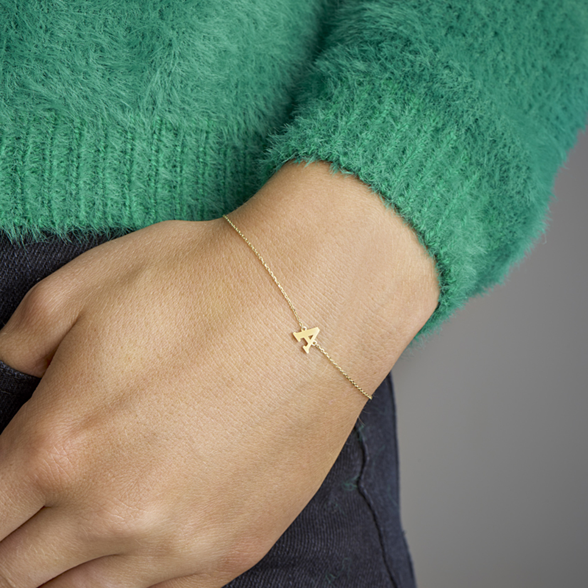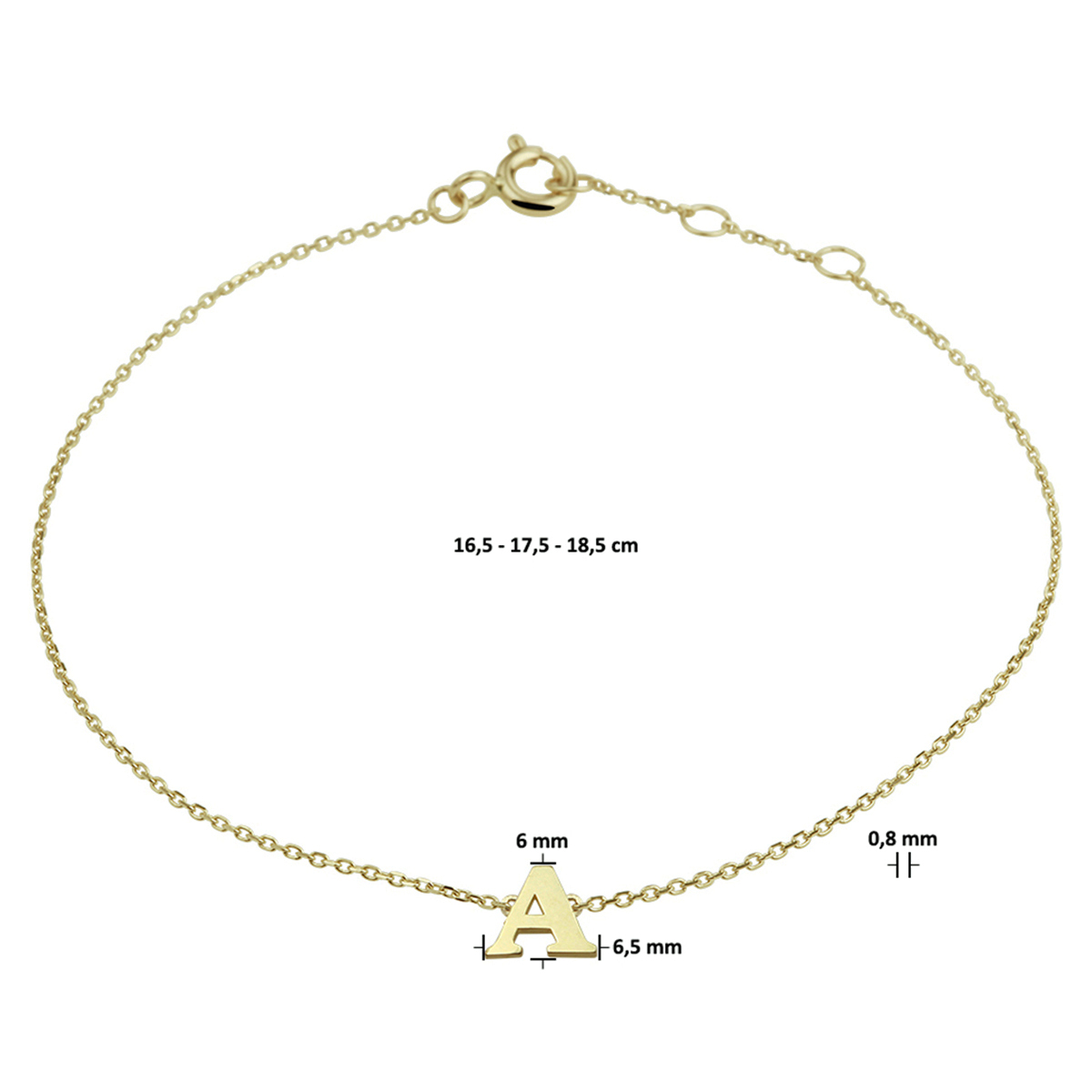 14k Geelgouden anker armband uitgevoerd met de letter A. De armband heeft draaglengtes van 16.5, 17.5 en 18.5cm. De letter heeft een afmeting van 6x6.5mm.