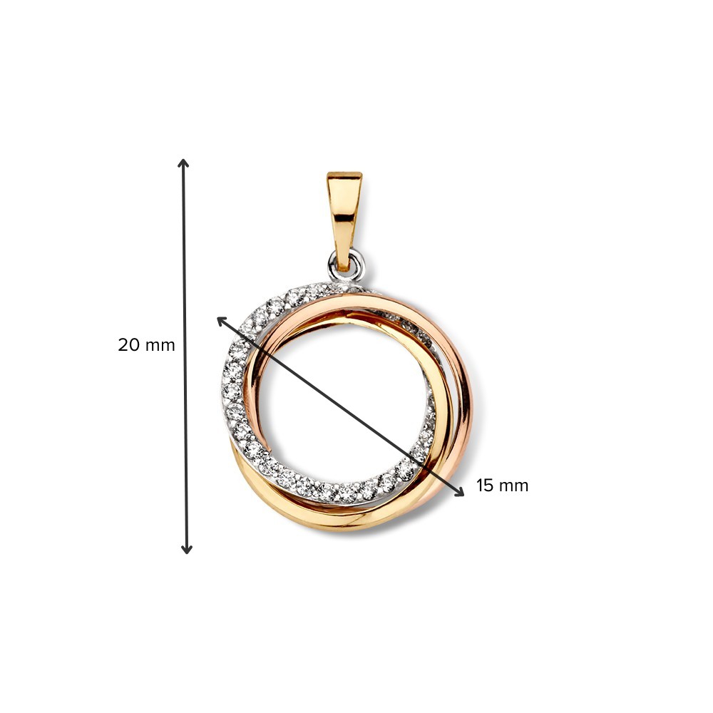 Excellent Jewelry gouden tricolor hanger van verbonden cirkels. De witgouden cirkel is gezet met fijne zirkonia's.