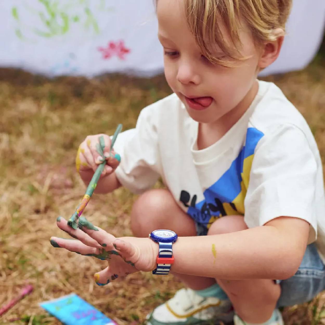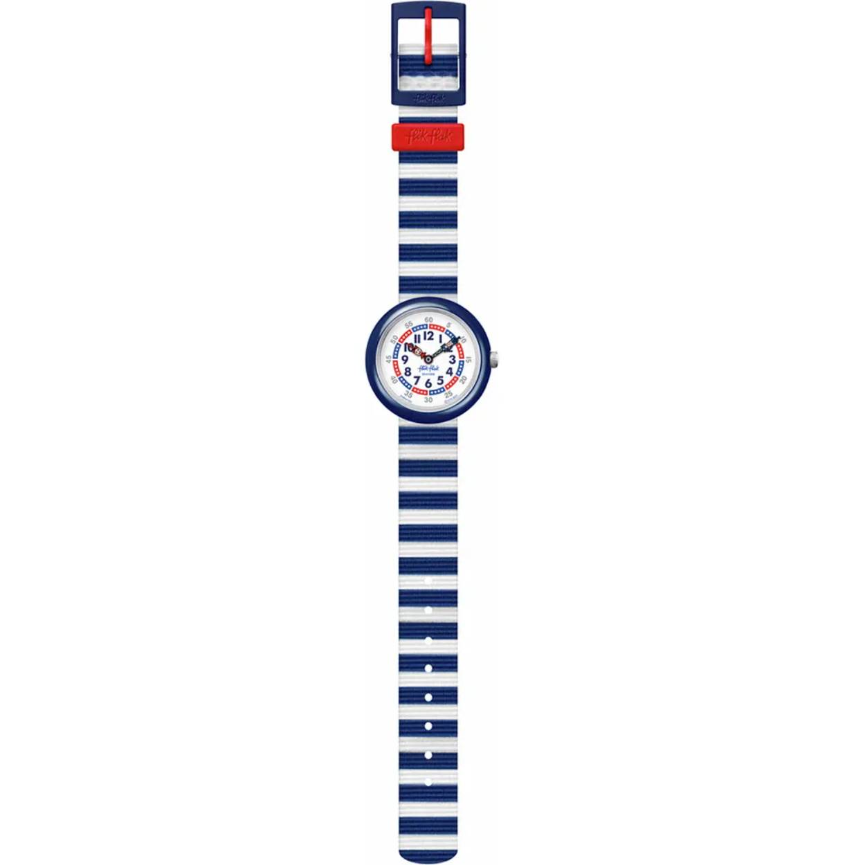 Dit Flik Flak horloge heeft een kunststof kast met een diameter van 30 mm en is voorzien van een textiel band. In de kast bevindt zich een ETA kwaliteitsuurwerk en is afgewerkt met Plexiglas.