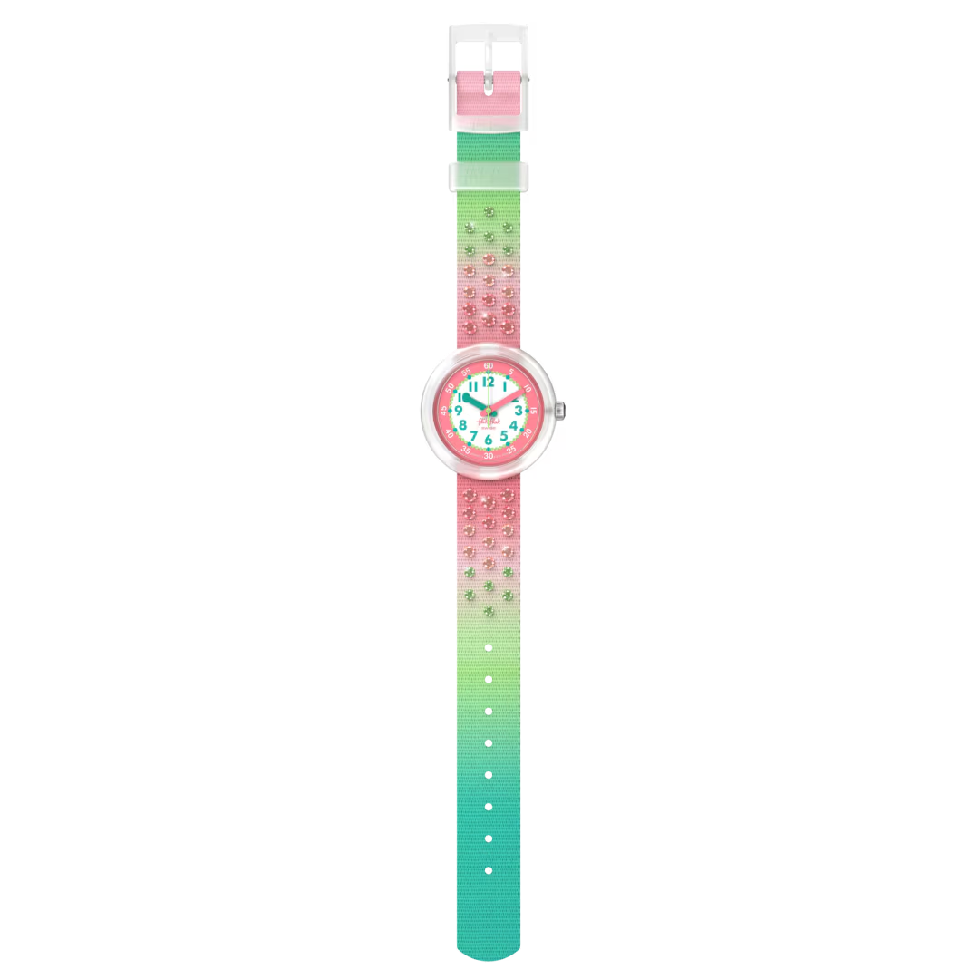SPARKLY MELON brengt fruitige vibes naar wie de tijd wil bijhouden! Het roze en groen en de kristallen glitters maken dit kinderhorloge opvallend, leuk en leerzaam. Een perfect speels cadeau met een fris design dat kinderen ook nog eens helpt om te leren klokkijken.