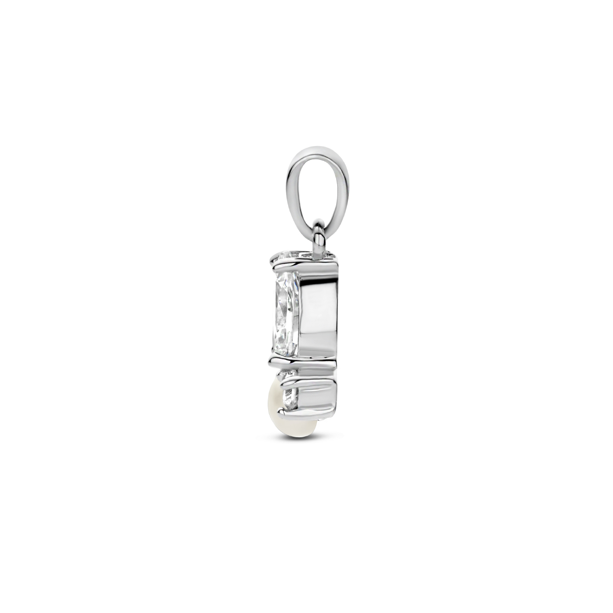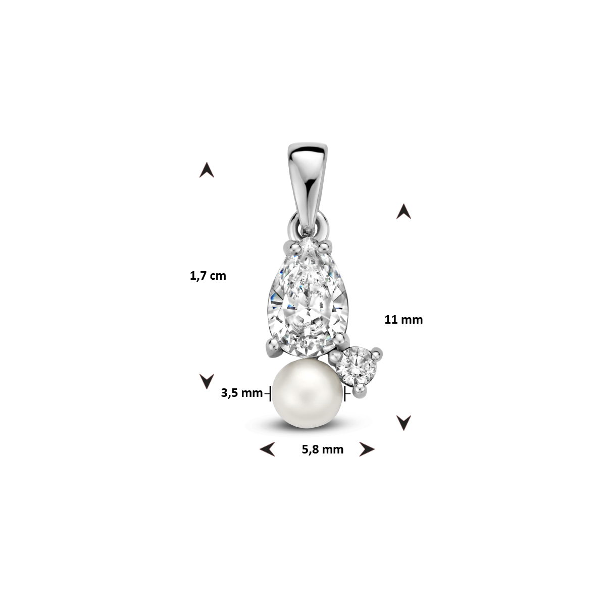 Gerhodineerd 925 zilveren hanger uitgevoerd met een schitterende zoetwaterparel en zirkonia. De hanger heeft een totale hoogte van 1.7cm en een breedte van 5.8mm. De parel heeft een diameter van 3.5mm.