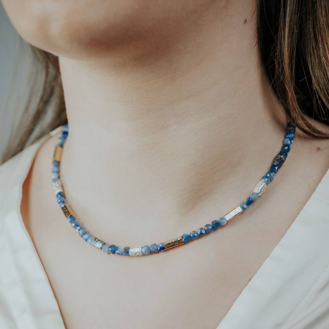 Collier uit de collectie van Jéh Jewels, gemaakt van 925 sterling zilver, geoxideerd zilver, Goldfilled en Kyaniet. Kyaniet is blauw van kleur en "The perfect match" bij al je favoriete spijkerbroeken. Draag haar samen met het bijpassende armband!