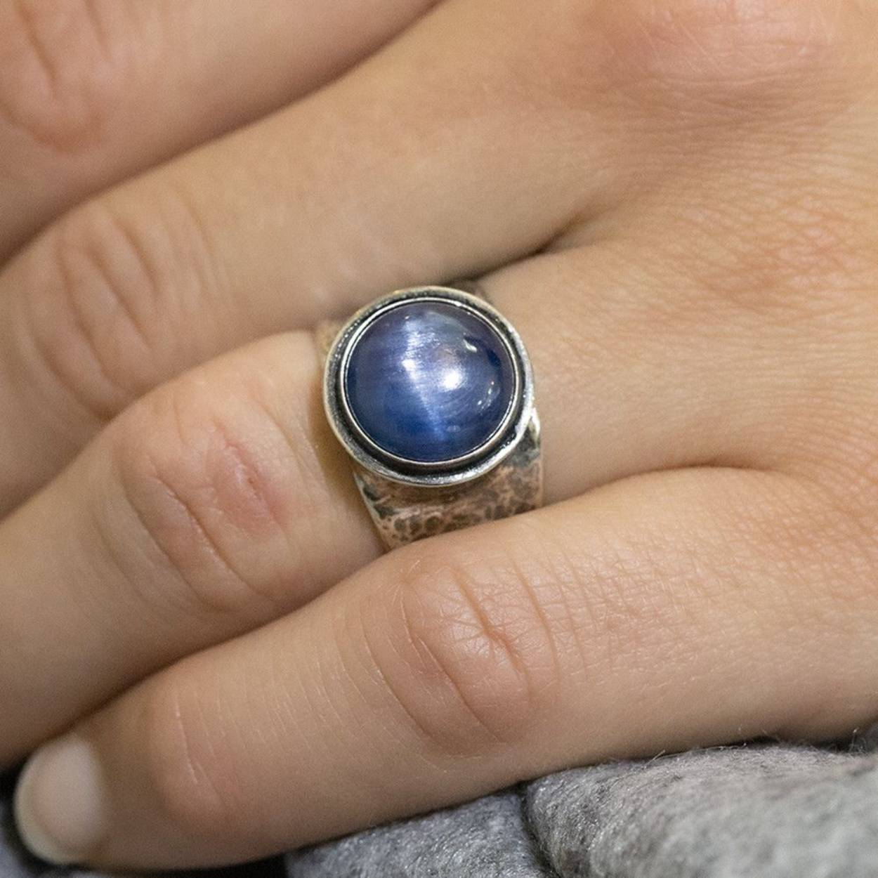 Ring gemaakt van 925 geoxideerd sterling zilver, met een edelsteen cabochon geslepen van Kyaniet. Kyaniet is een spirituele steen met een kalmerende en evenwichtige werking. Het helpt ons de regie over ons eigen leven voeren en om in te zien dat we geen marionetten van het lot zijn maar onze eigen toekomst vorm kunnen geven.