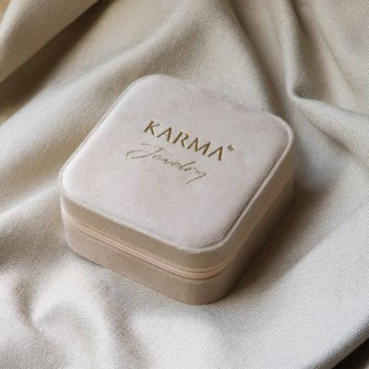 De KARMA JEWELRYBOX is een luxe sieraden box om je sieraden in op te bergen. Met deze travel case kan je gemakkelijk je KARMA Jewelry opbergen en mee nemen. De jewelrybox heeft een zachte beige kleur en is gemaakt van fluweel.