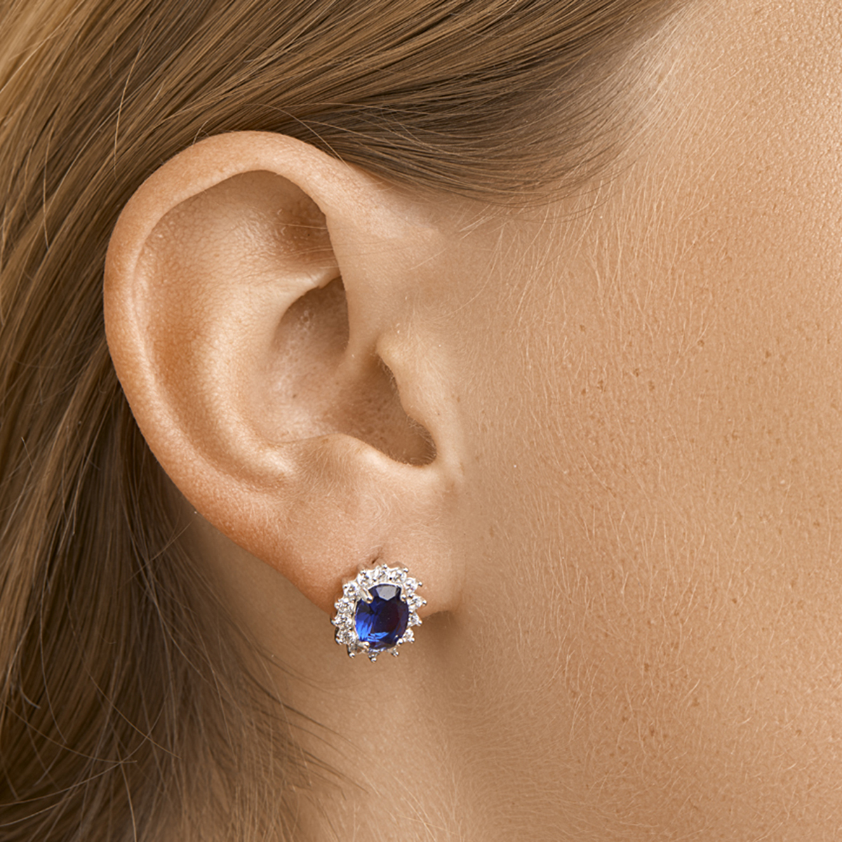 Gerhodineerd zilveren oorknoppen met zirkonia en synthetische saffier.