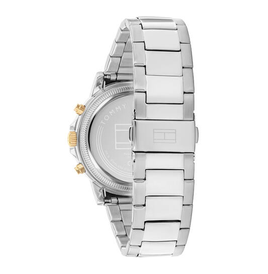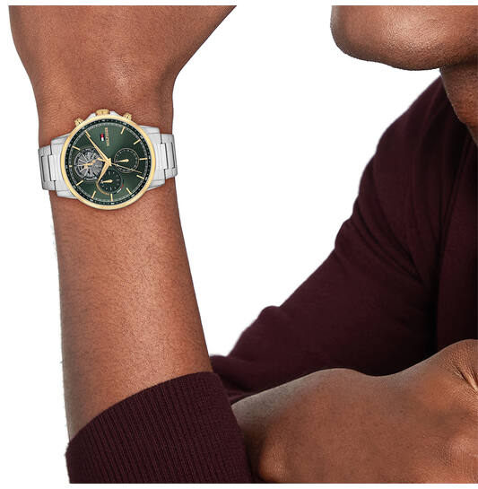Tommy hilfiger herenhorloge Stewart met zilverkleurige band, goudkleurige kast en open groene wijzerplaat