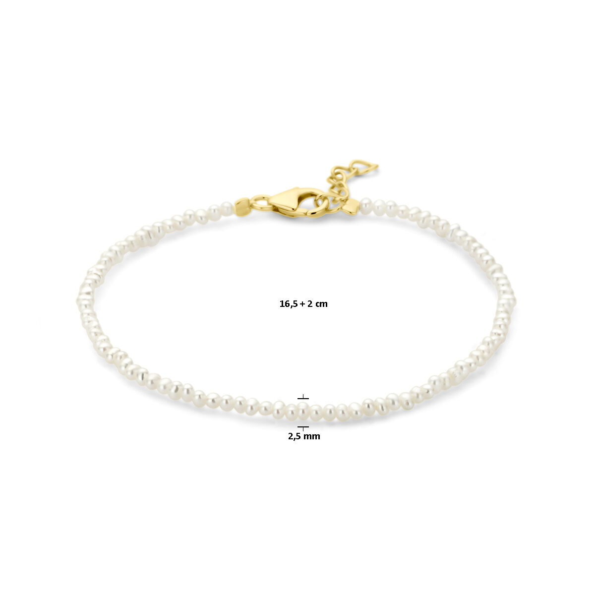 Zilver verguld armbandje uitgevoerd met kleine parels. De armband heeft een draaglengte van 16.5cm met 2cm extensie. Geen garantie op de plating.