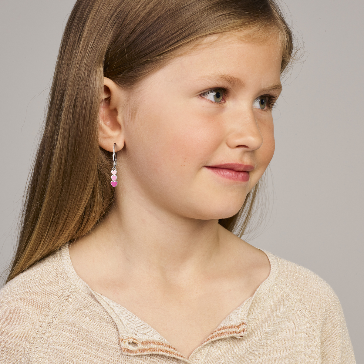 Gerhodineerd 925 zilveren oorhangers uitgevoerd met hartjes met lichtroze, roze en donkerroze emaille. De oorhangers hebben een totale hoogte van 25mm.
