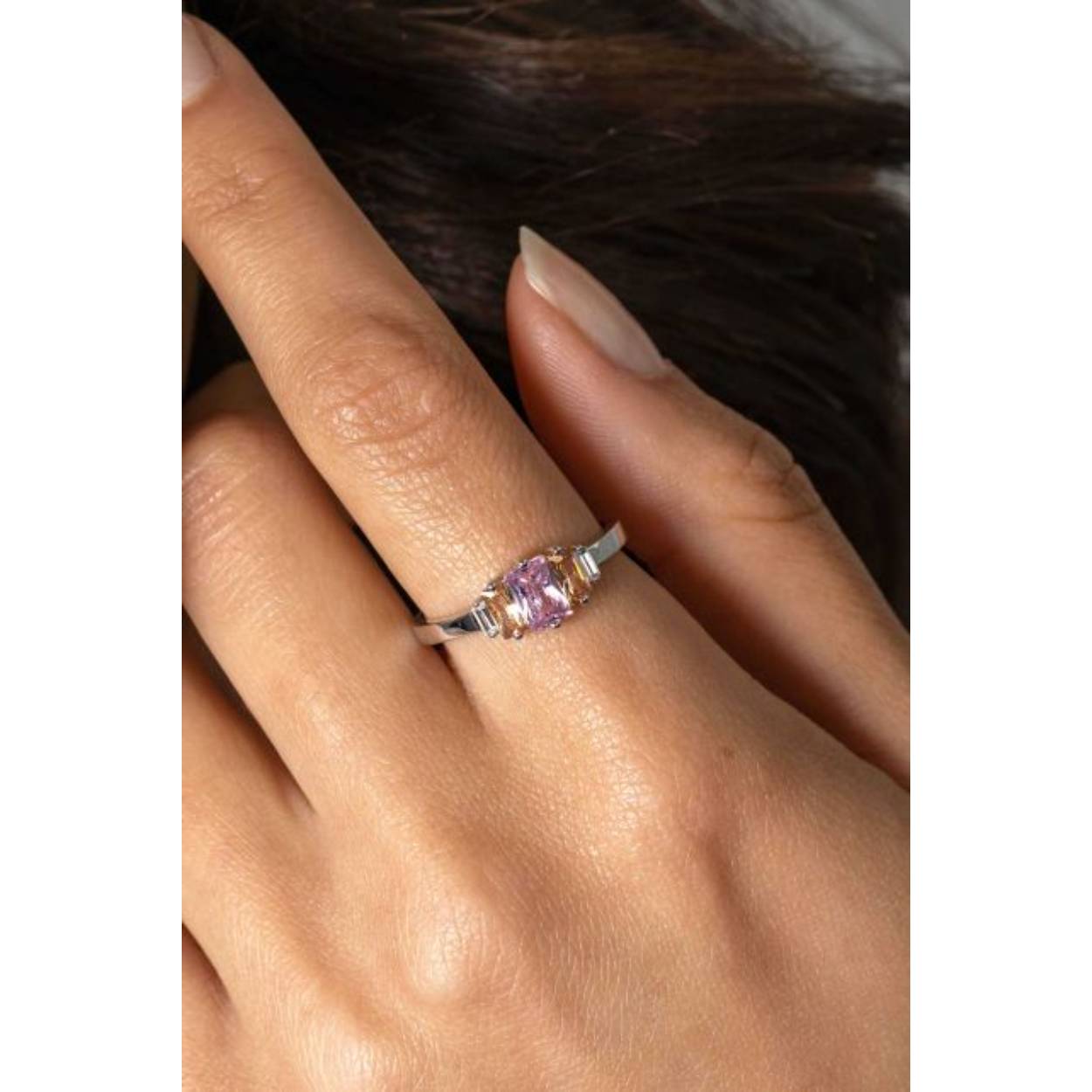 ZINZI zilveren ring, bezet met baguette geslepen zirconia's in de kleuren wit, champagne en roze ZIR2490
